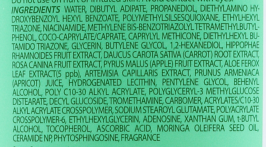 Water, Dibutyl Adipate, Propanediol, Diethylamino Hydroxybenzoyl Hexyl Benzoate, Polymethylsilsesquioxane, Ethylhexyl Triazone, Niacinamide, Methylene Bis-Benzotriazolyl Tetramethylbutylphenol, Coco-Caprylate/Caprate, Caprylyl Methicone, Diethylhexyl Butamido Triazone, Glycerin, Butylene Glycol, 1,2-Hexanediol, Pentylene Glycol, Behenyl Alcohol, Poly C10-30 Alkyl Acrylate, Polyglyceryl-3 Methylglucose Distearate, Decyl Glucoside, Tromethamine, Carbomer, Acrylates/C10-30 Alkyl Acrylate Crosspolymer, Fragrance, Sodium Stearoyl Glutamate, Polyacrylate Crosspolymer-6, Ethylhexylglycerin, Adenosine, Xanthan Gum, t-Butyl Alcohol, Tocopherol (Vitamin E), Hippophae Rhamnoides Fruit Extract, Ascorbic Acid (Vitamin C), Daucus Carota Sativa (Carrot) Root Extract, Rosa Canina Fruit Extract, Pyrus Malus (Apple) Fruit Extract, Prunus Armeniaca (Apricot) Juice, Moringa Oleifera Seed Oil, Ceramide, Phytosphingosine, Aloe Ferox Leaf Extract, Hydrogenated Lecithin, Artemisia Capillaris Extract